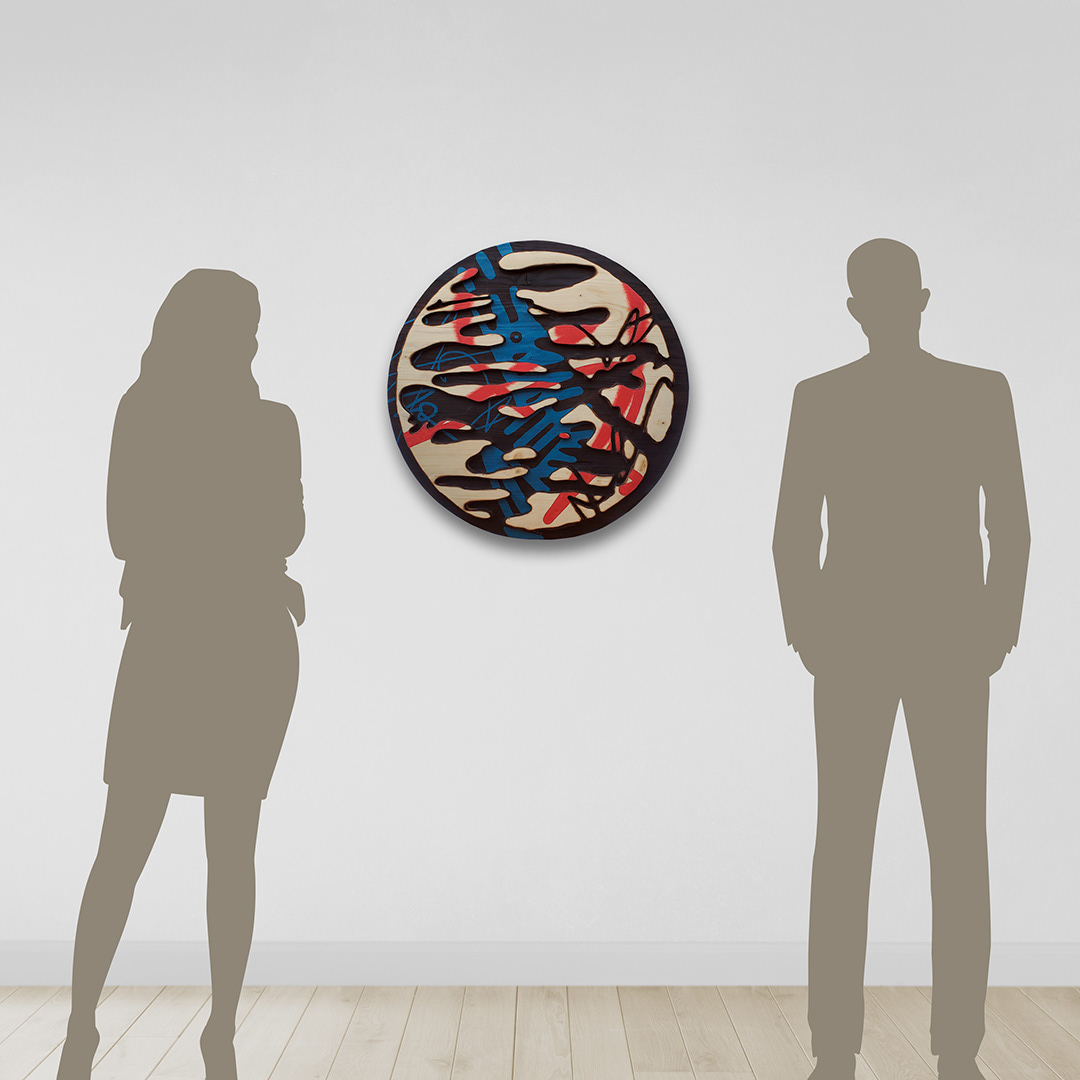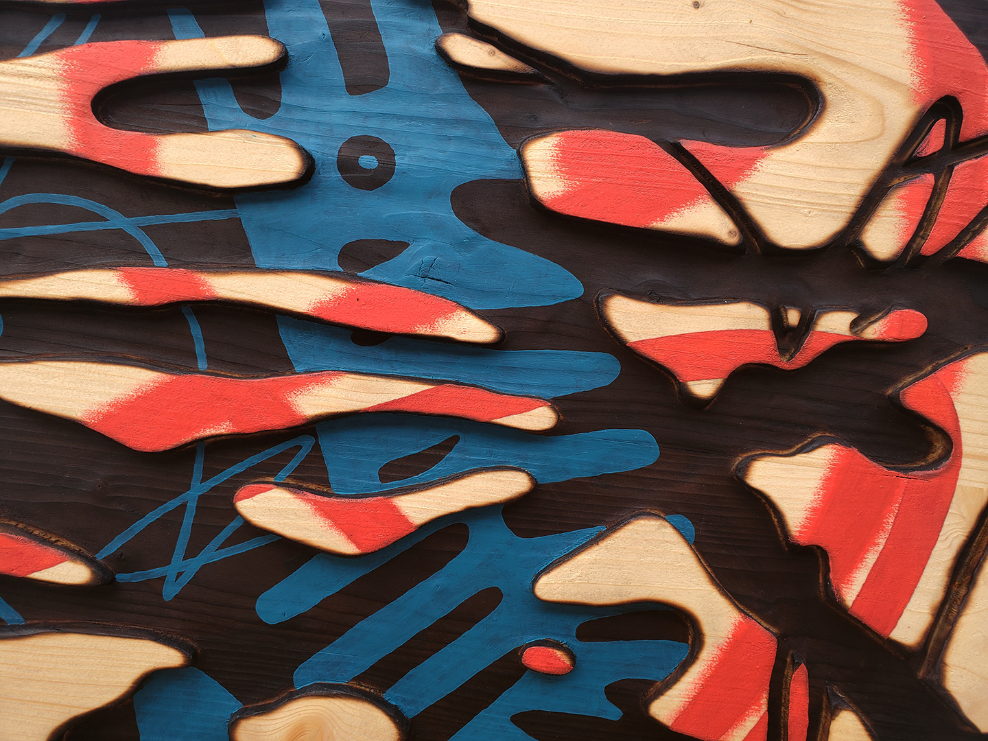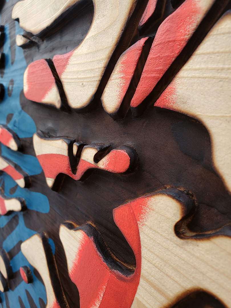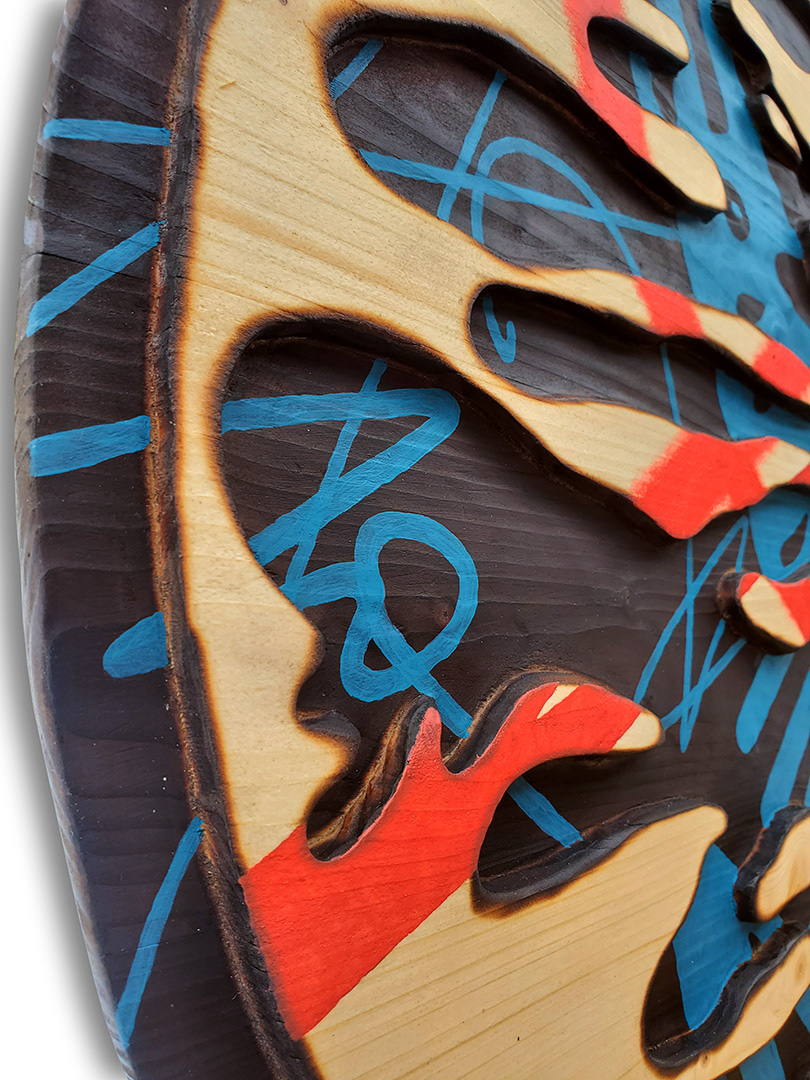 Acrylique, pastels à l'huile sur bois sculpté et brûlé / Acrylic, oil pastels on sculpted and burned wood