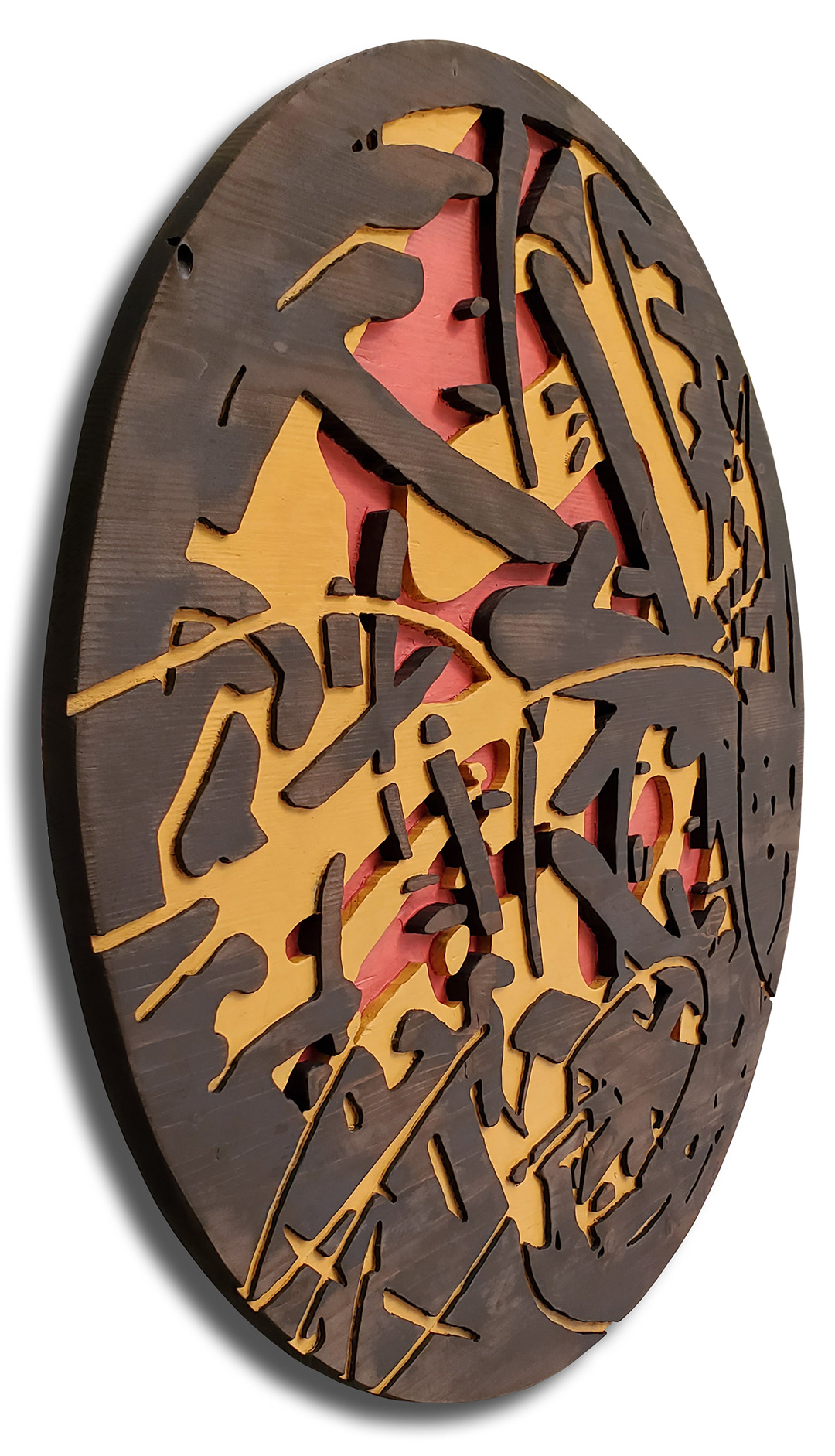 Acrylique, teinture sur bois sculpté et brûlé / Acrylic, stain on sculpted and burned wood
