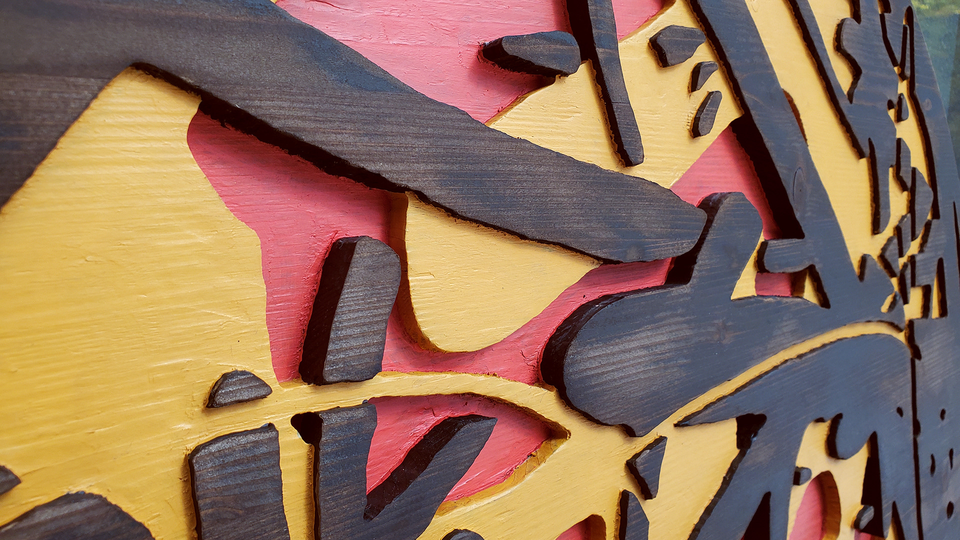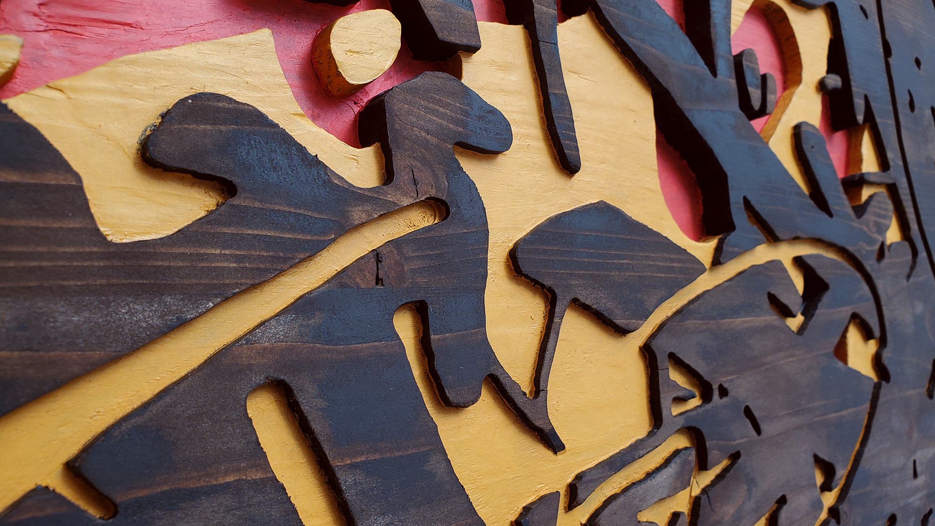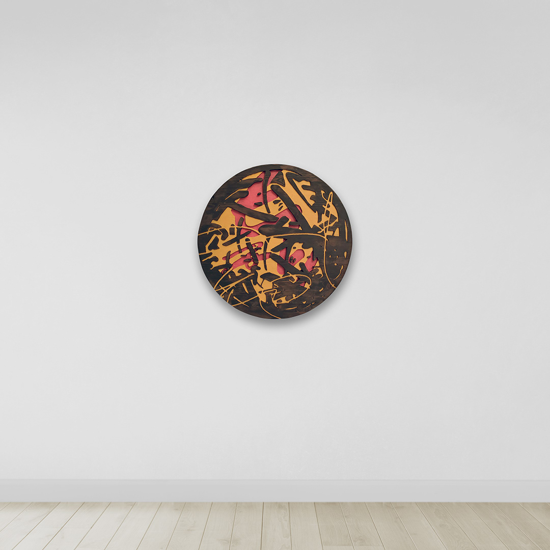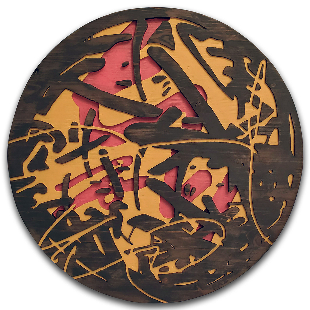 Acrylic, stain on sculpted and burned wood