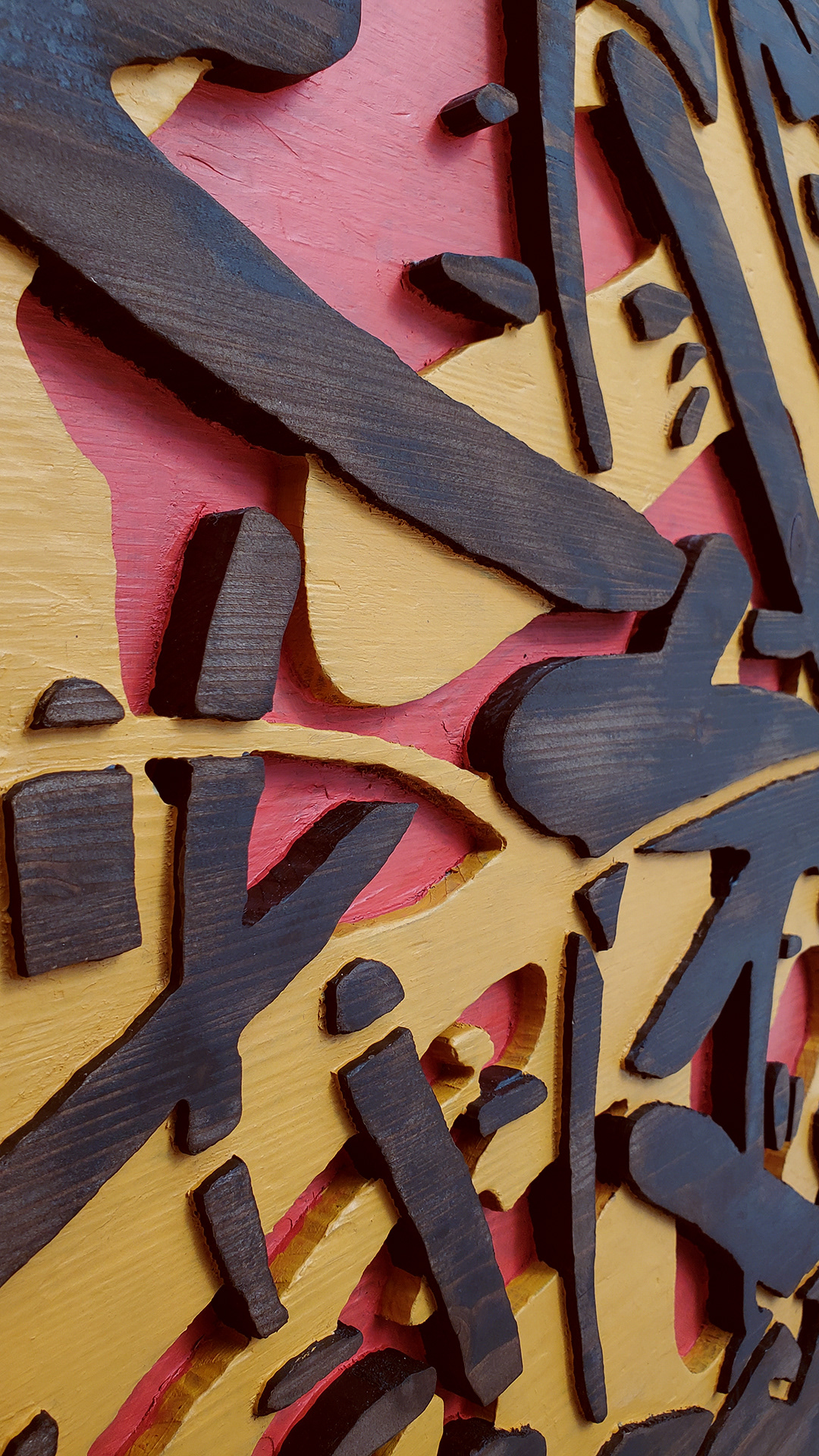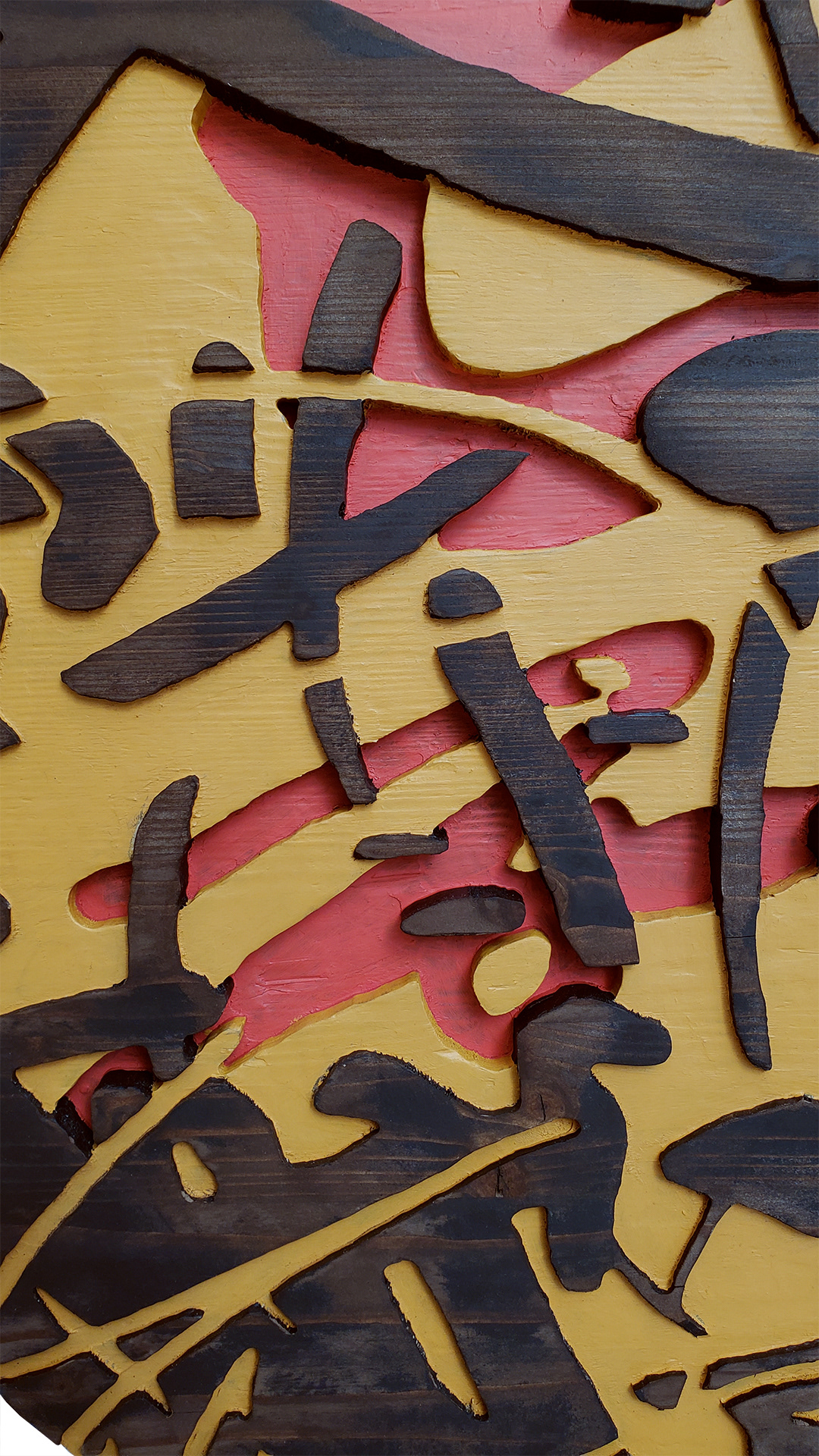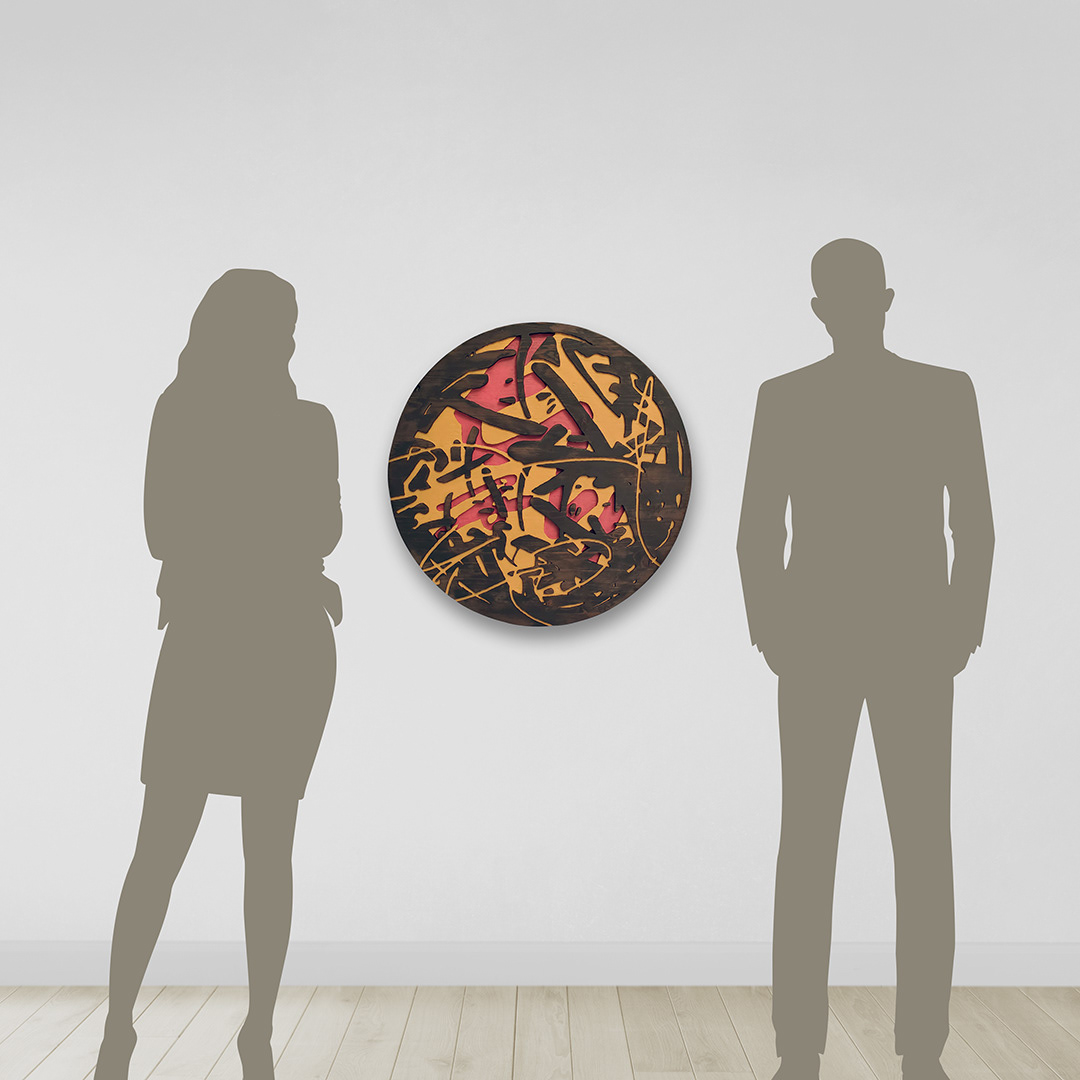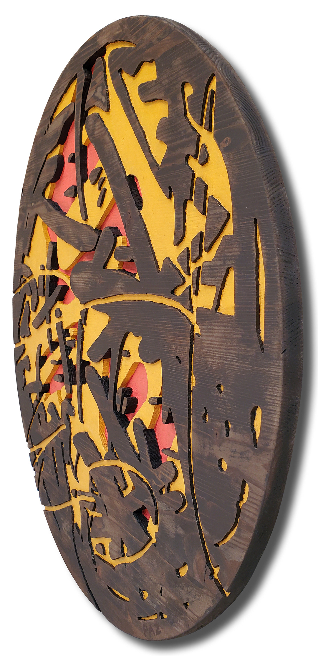 Acrylic, stain on sculpted and burned wood